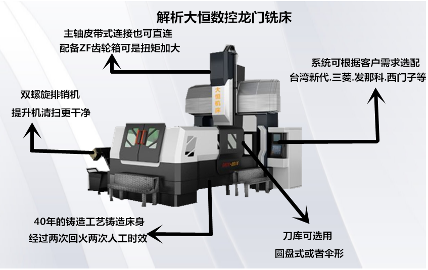 4. 主軸采(cǎi)用中國(guó)台灣BT50外(wai)徑190适合(he)重切削(xue),可加變(biàn)速箱。